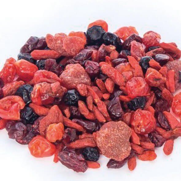 O mix é composto pelas frutas: morango, cereja, cranberrry e gojiberry.