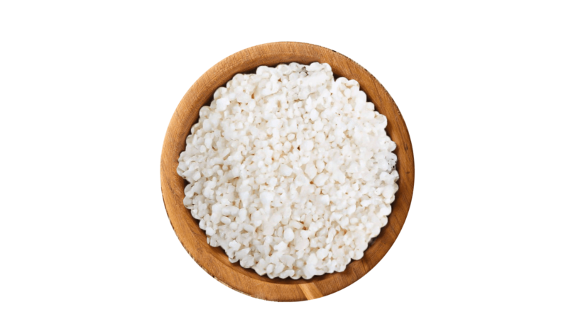A tapioca granulada é um subproduto da mandioca, com grânulos maiores que a tapioca mais fina, o que lhe confere uma textura e consistência únicas. Quando hidratada, expande e adquire uma textura gelatinosa.
