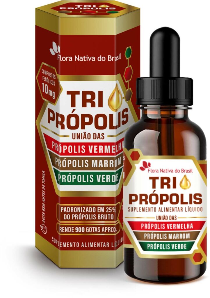 Blend de própolis verde, própolis vermelho e própolis marrom.